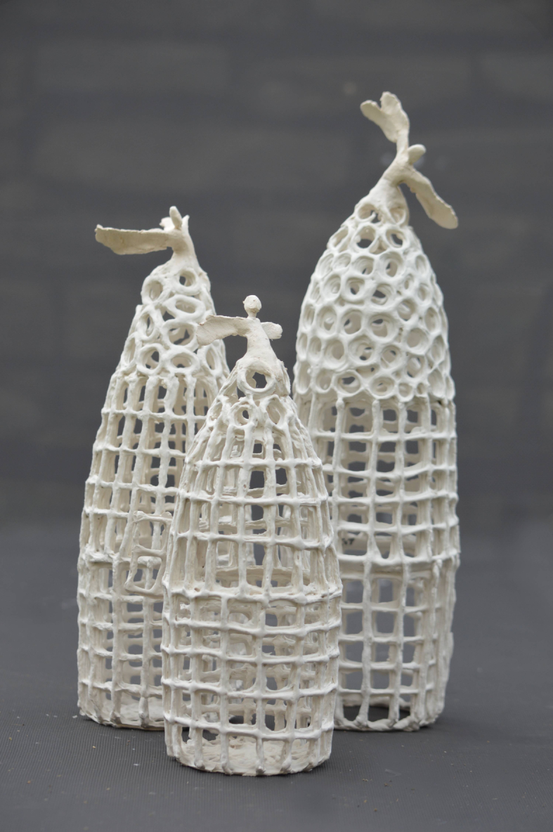 Je travaille essentiellement la porcelaine papier. Elle devient un moyen d'expression, me permettant de créer des structures subtiles et raffinées. J'applique minutieusement, couche après couche, la porcelaine papier liquide à la poire. Un temps suspendu, propice aux interrogations sur la vie, la société et à une croissance commune.