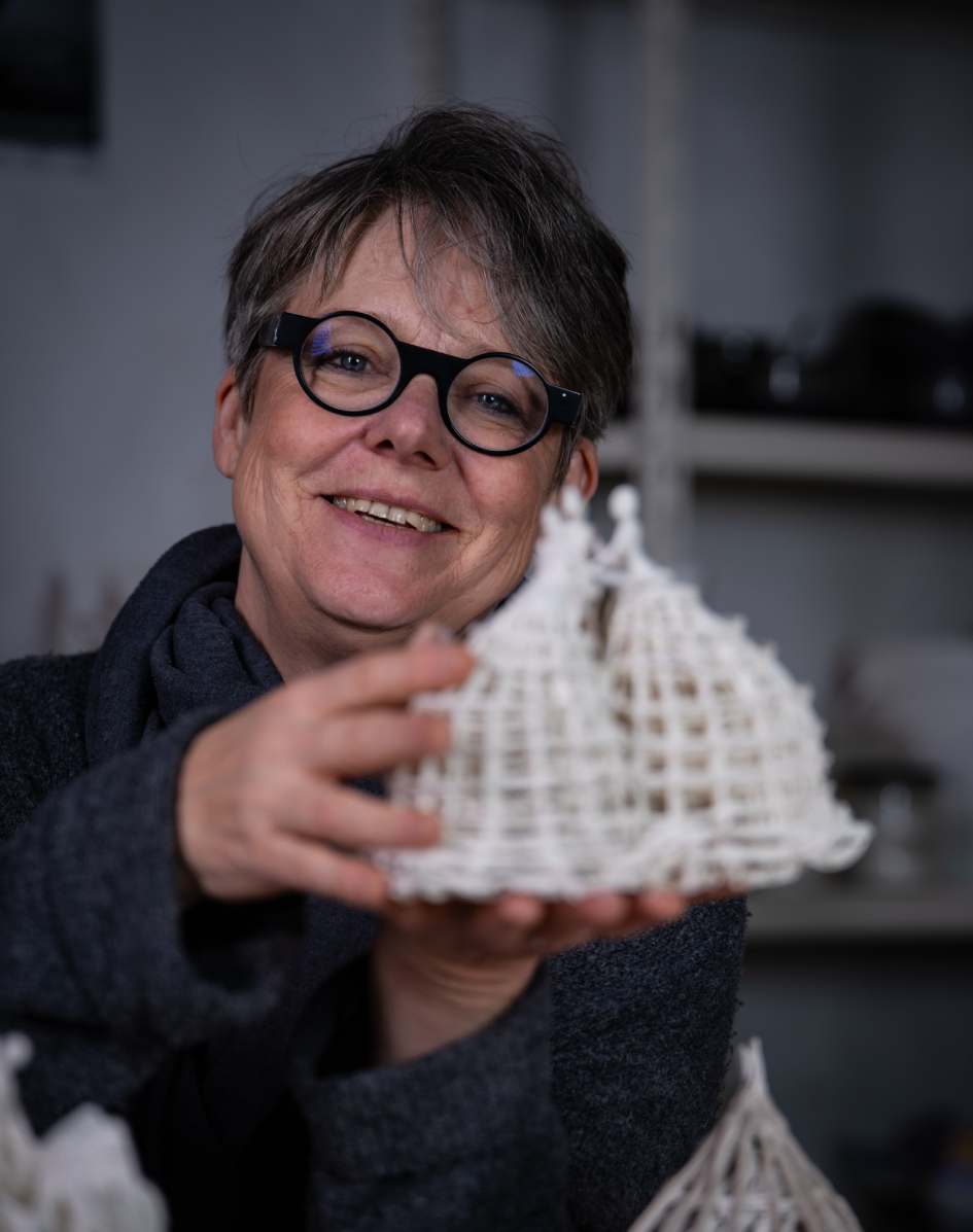 Mijn werk bestaat uit gedraaid aardewerk, steengoed en porselein Maar nu maak ik ook vogelobjecten, die zijn een klein stilleven en vertellen een verhaaltje over samen een onuitgesproken wereld vormen. Het is van porselein met soms wilgen of hazelaarshout