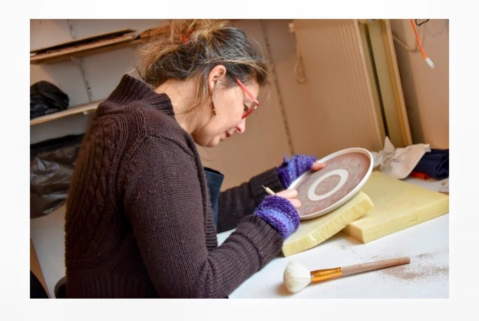 Je tourne des petites séries de poteries artisanales en grès. Tout est cuit en électrique à 1250 degrés. Toutes mes céramiques sont entièrement tournées et décorées à la main. Mon décor est aux engobes et sgraffito. Ce sont principalement des poteries utilitaires. J'aime rythmer mon décor avec des motifs graphiques répétés. Mon inspiration vient de la nature, des papiers peints, des tissus et du graphisme.