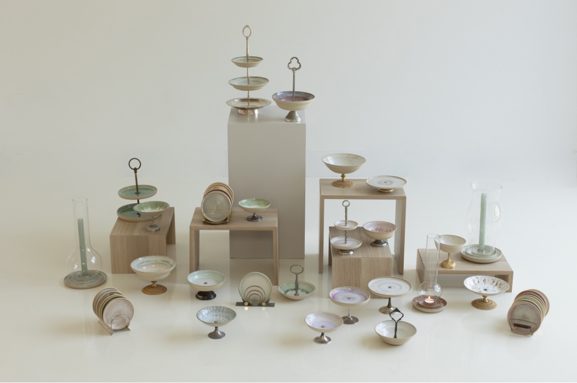 Een combinatie van ronde vormen, herhaling en zachte tinten. Naast handgemaakte zee-egel bollen van steengoed en fortune cookies van porselein heb ik een upcycle-collectie van steengoed schalen/etagières. Deze zijn allen gecombineerd met onderdelen uit verschillende kringloopwinkels.